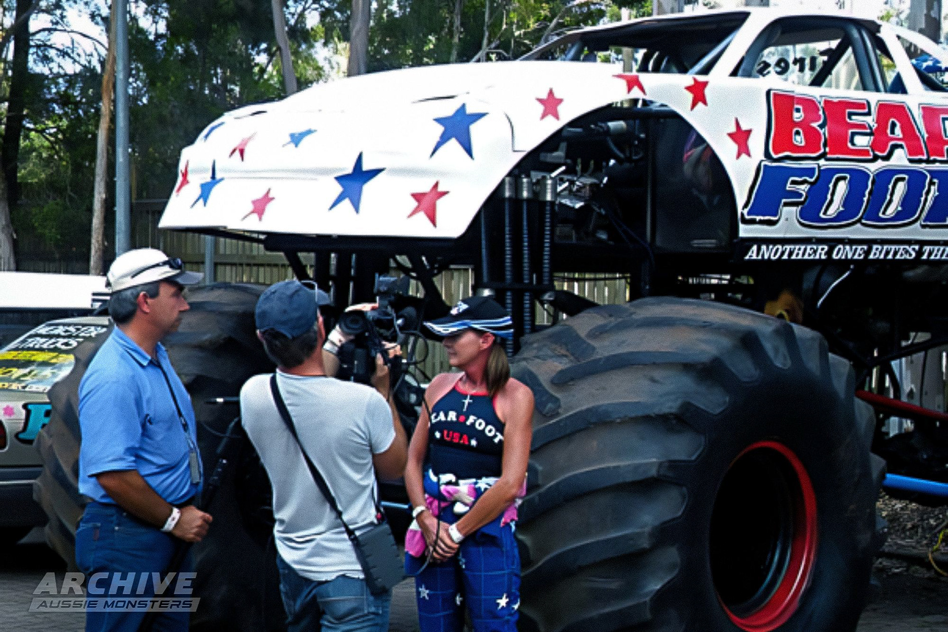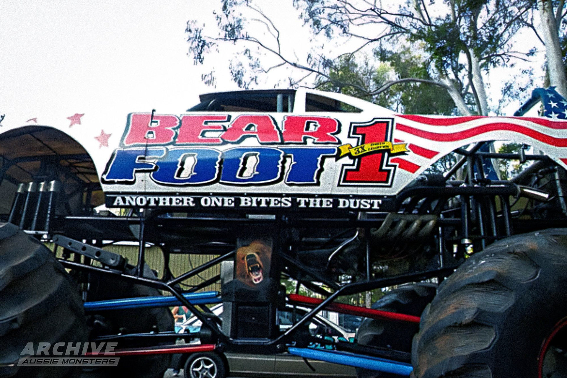 Bearfoot 1, originally owned by KC's Fireworks, started its life as 'Generation X'. The chassis ran under multiple identities in the United States, such as 'Cyclops', 'King Kong', 'El Bandito', 'Monster Patrol' and 'Bearfoot', before being sold to KC's Fireworks and shipped to Australia. The truck was sold to Robert Stevenson, the owner of Ace Fireworks, and received a visual overhaul from the original Chevrolet S-10 to align with Stevenson's love of Speedway.