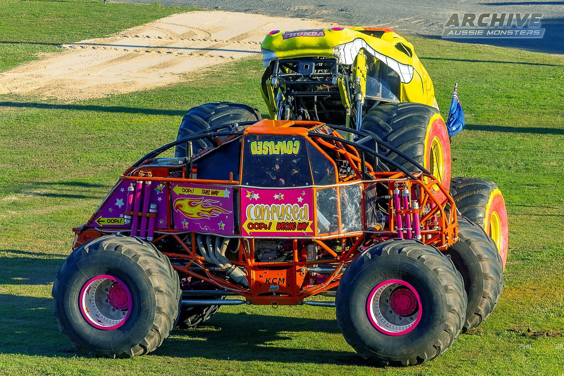 Confused acts as Monster Truck Promotions Australia's response to the growing demand for two-wheel skills at events across the country, acting as a purpose-built moonwalk and rollover truck. Its unique bare chassis design allows it to perform stunts without the extensive repair costs associated with traditional fibreglass bodies, allowing the team to be less restricted with their on-track performance.