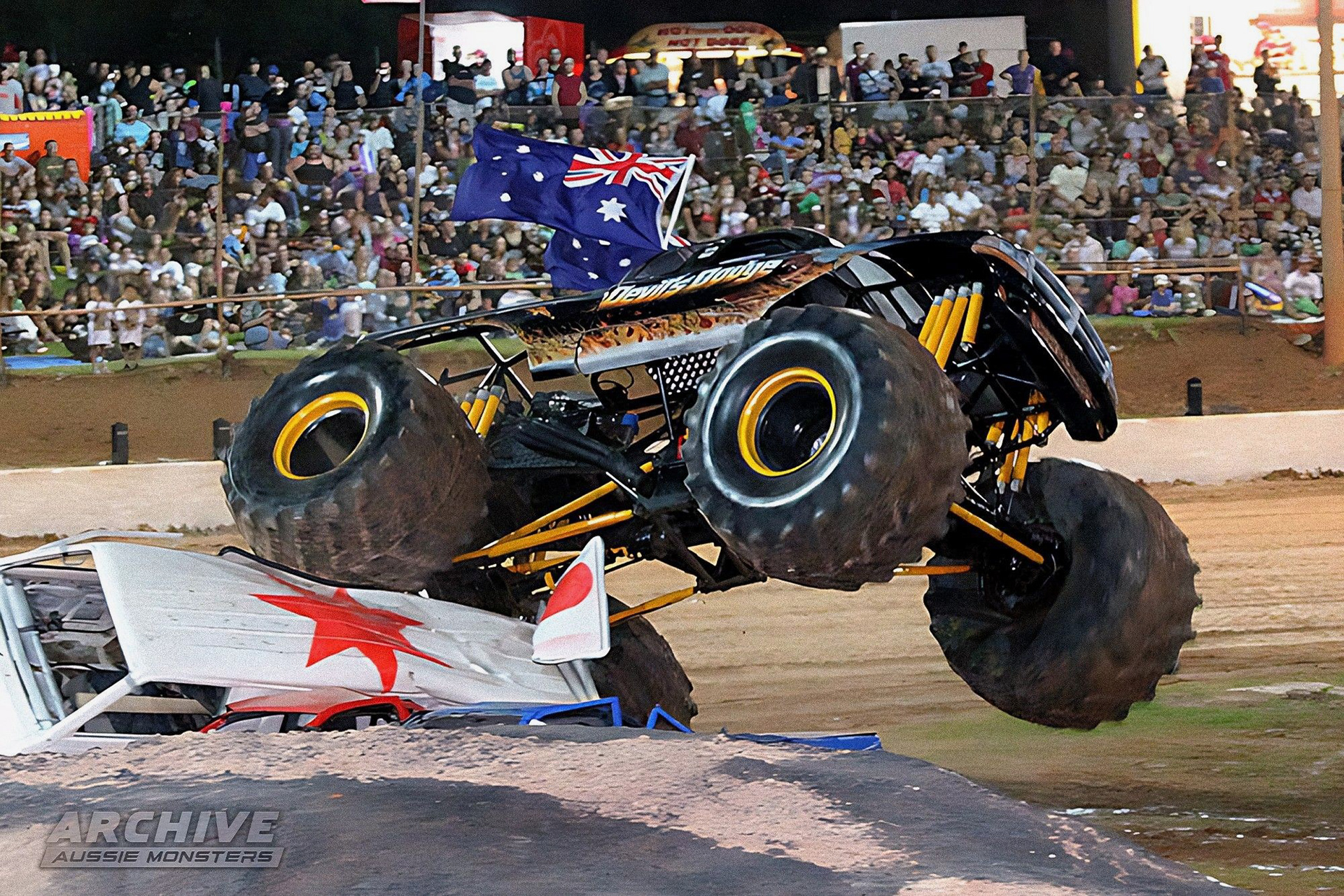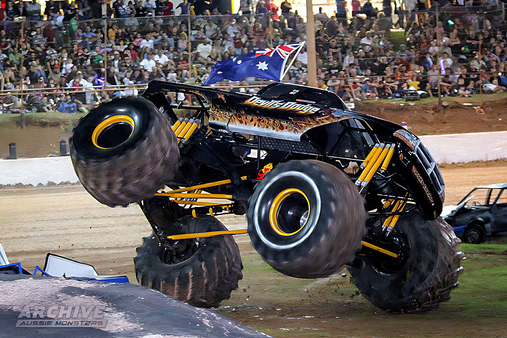 The second Devil's Dodge started its life as 'Generation X'. The chassis ran under multiple identities in the United States, including 'Cyclops', 'King Kong', 'El Bandito', 'Monster Patrol', and 'Bearfoot', before being sold to KC's Fireworks and shipped to Australia, where it operated as Bearfoot USA. The truck was sold to Robert Stevenson, the owner of Ace Fireworks, and was subsequently renamed and redesigned into Bearfoot 1. It went on to become the second Devil's Dodge, running the same body as it did under KC's Fireworks ownership.