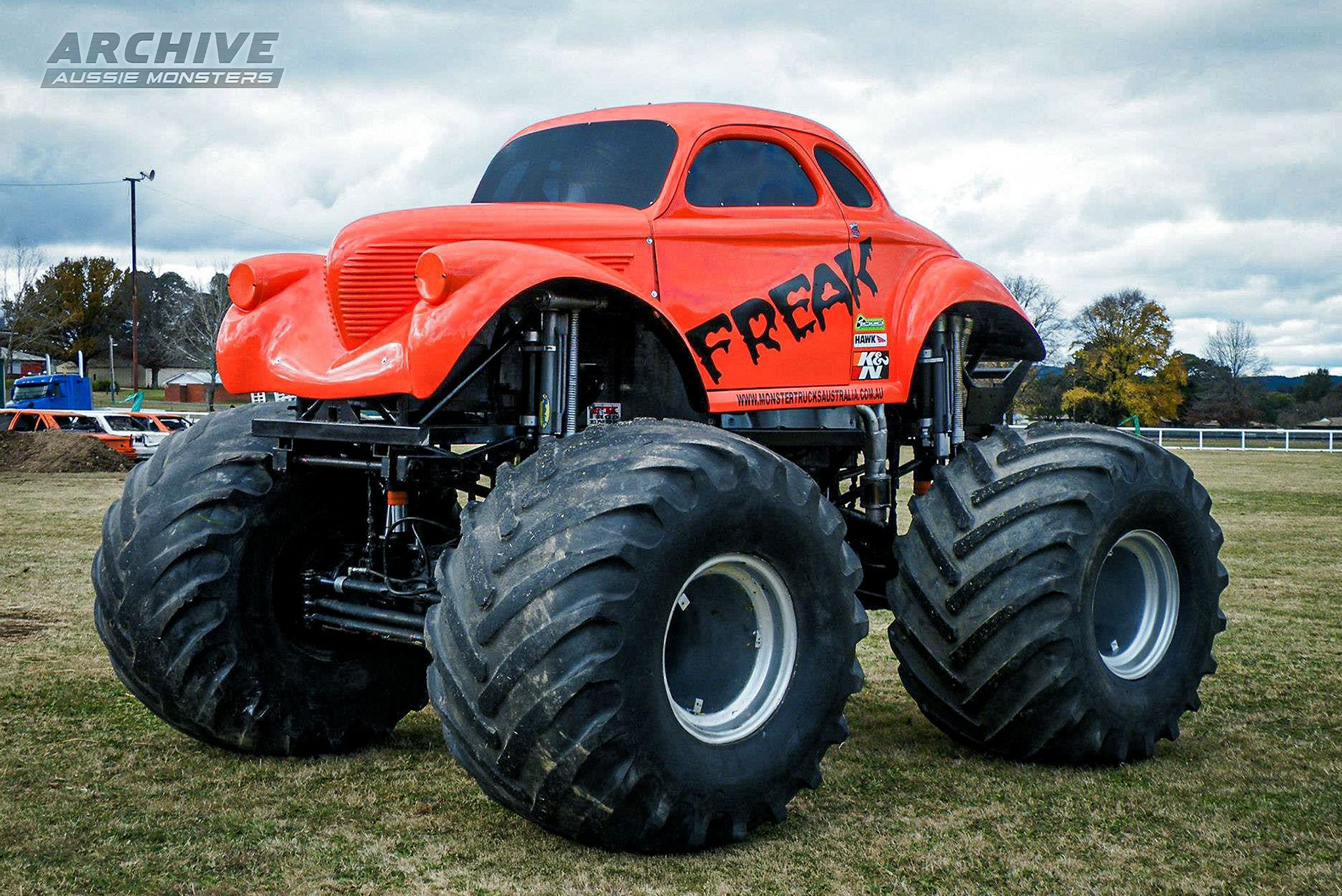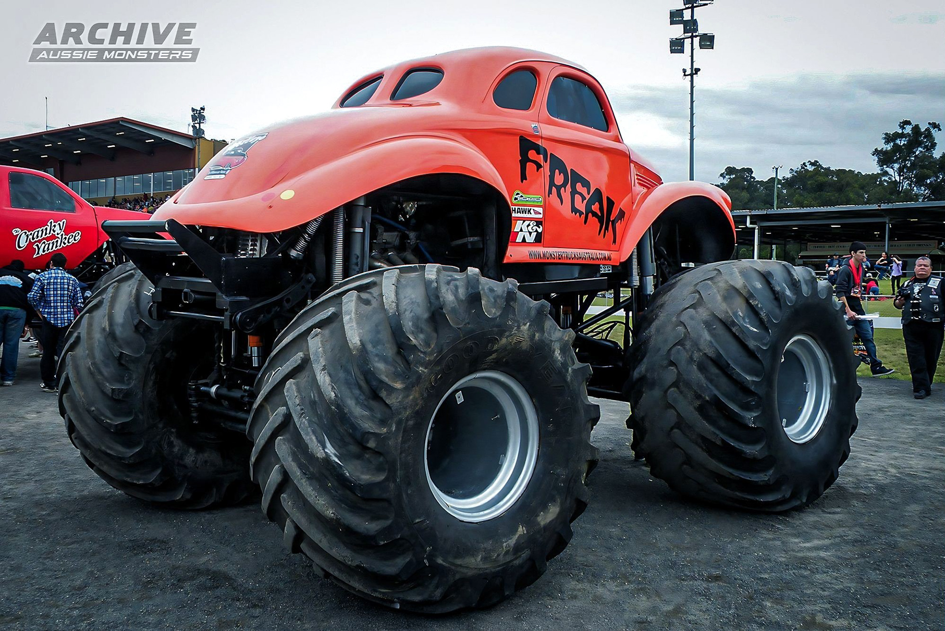 Freak was a modern-day adaptation of the timeless hot rod and was noteworthy for its shorter stature and lighter build, making it ideal for performing wheelies. The original chassis was formerly Freak Show. It can be differentiated from the second version through its black powdercoat (see both images below) and ran temporarily as 'Backflip Black Betty', 'Leory' and 'K-Rock'. The second chassis, recognisable by its grey powdercoat, was converted into Executioner in 2017 and occasionally runs as a backup truck at select Monster Events shows.