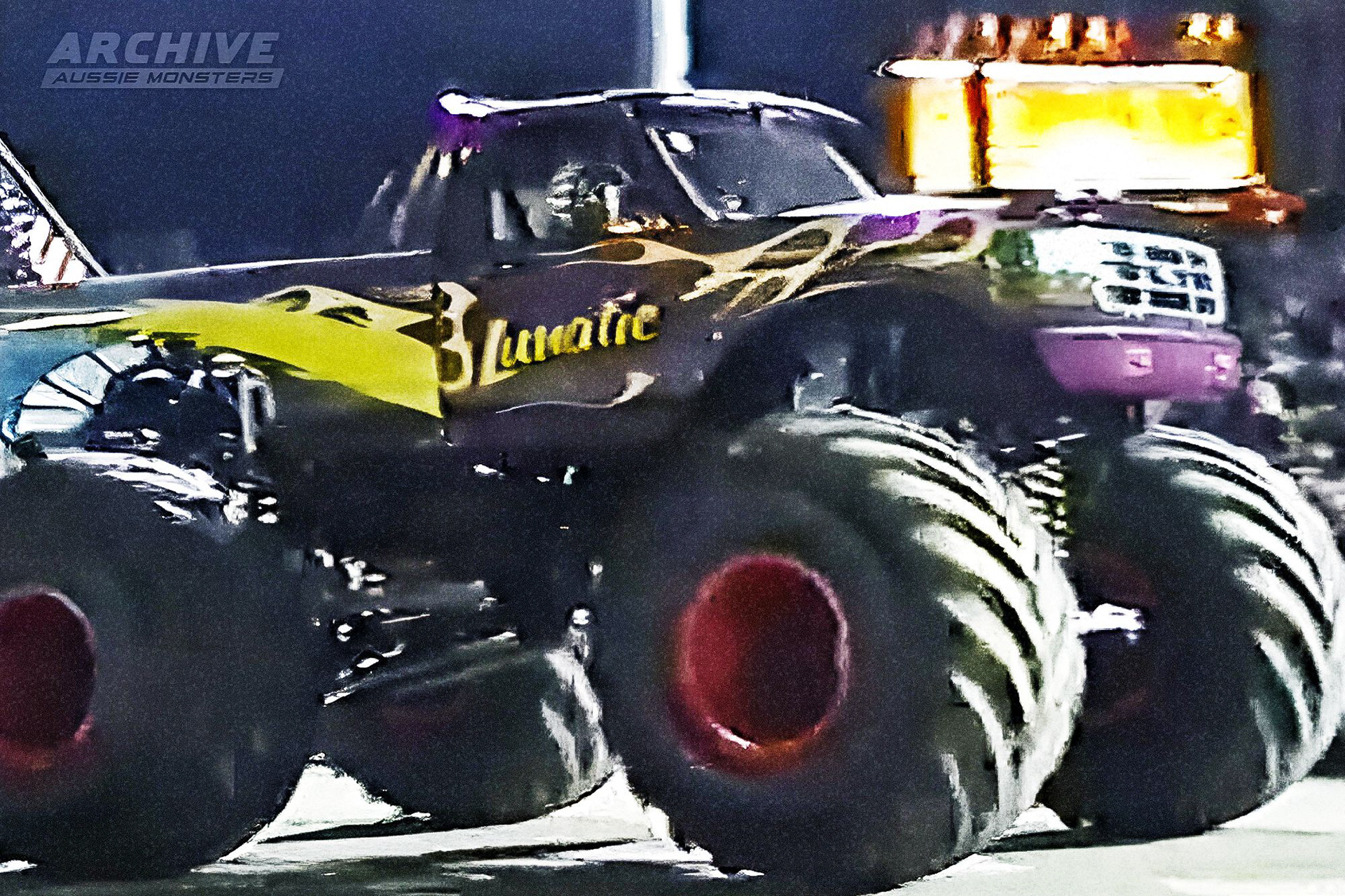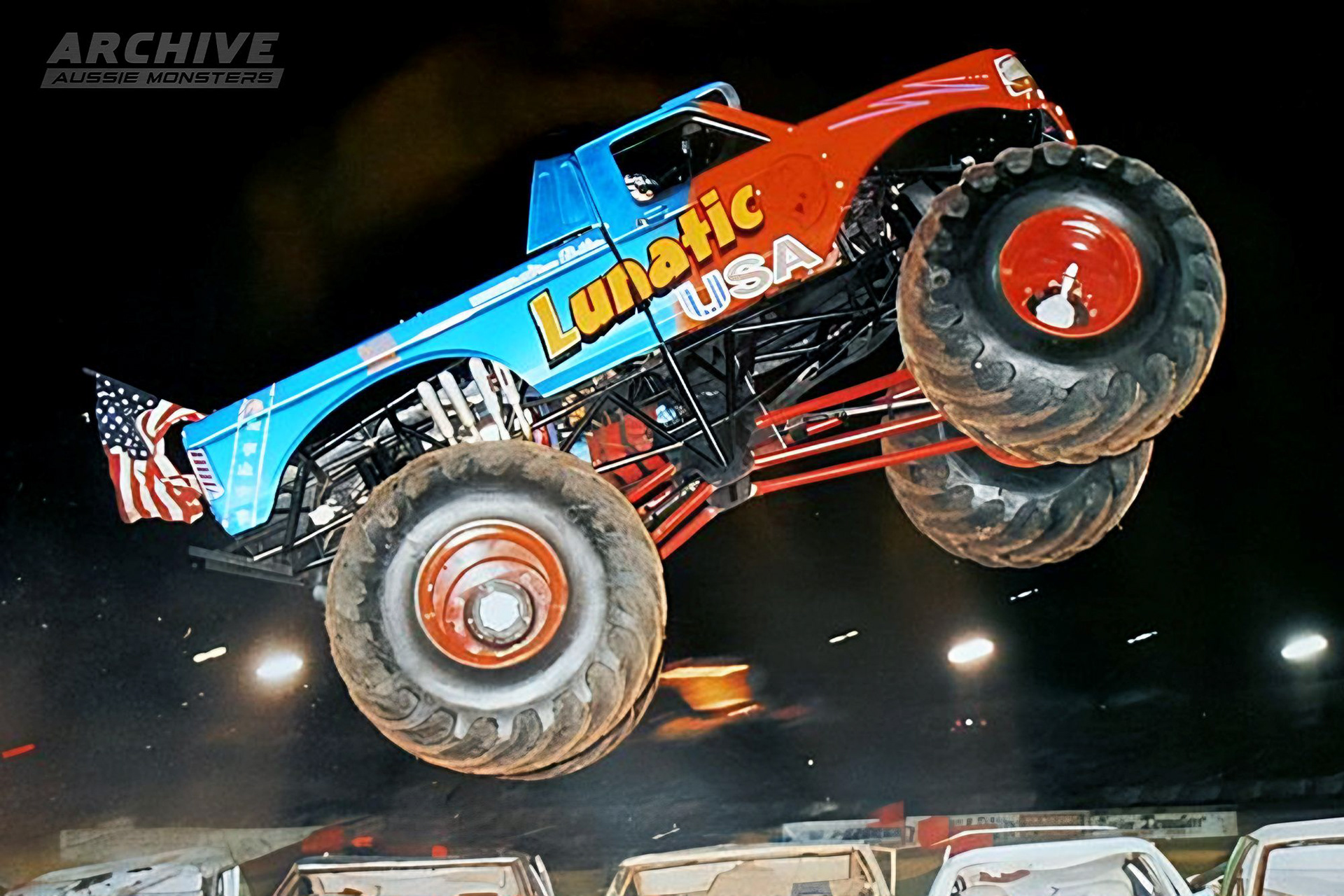 Lunatic USA initially started as the second Rocky Mountain Thunder in the United States. After being imported to Australia by Vic Butler in 1999, it was renamed to 'Lunatic', but the body remained largely unchanged aside from the name change (see the right image). It would later receive a new bold orange and blue paint scheme and was renamed to 'Lunatic USA' (see the left image). It continued to run the design until it was sold to Clive Featherby, who rebranded the truck into the Australian version of Calvin Carrington's 'The Rock' in 2001.